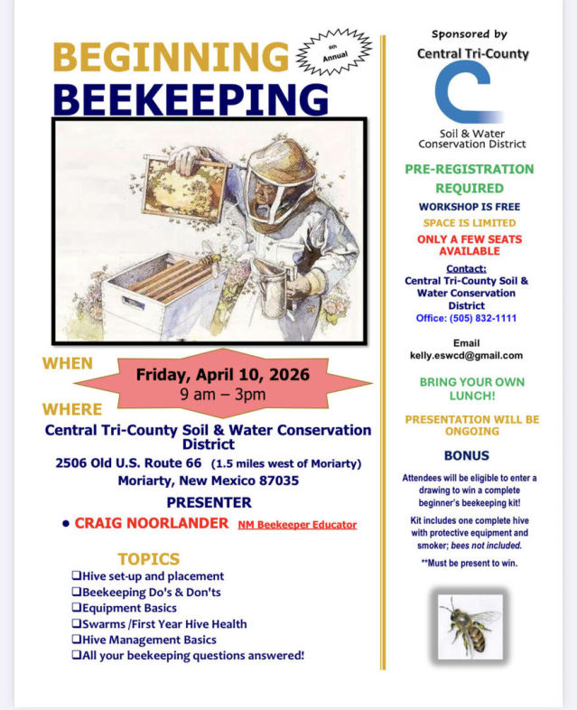 The Central Tri-County Soil & Water Conservation District is hosting the 6th Annual Beginning Beekeeping Workshop at thier Administrative Building in Moriarty on Friday, April 10, 2026. See flyer below!